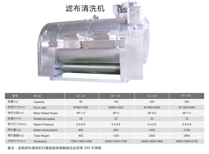 濾布清洗機(jī)外形美觀大方,節(jié)能環(huán)保,運(yùn)行平穩(wěn),滾籠采用不銹鋼制作,抗腐蝕能力強(qiáng),經(jīng)久耐用,轉(zhuǎn)軸兩端采用耐酸、耐堿、耐磨性優(yōu)良的氟橡膠油封、使軸兩端不易漏,不會磨損、污染濾布。采用微電腦控制,洗滌時間,洗滌溫度根據(jù)衣物的具體情況任意設(shè)定,使用維修方便,占地面積少,噪音低。
